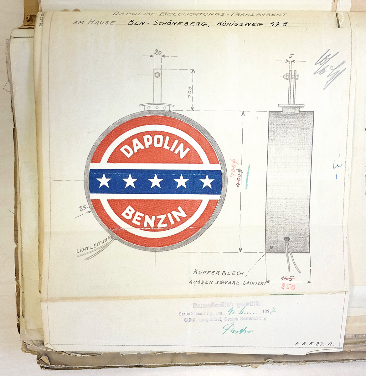 Entwurf für ein »Dapolin-Beleuchtungs-Transparent« am Haus der Firma Schöneberger Garagen am damaligen Königsweg 37d, Juni 1927