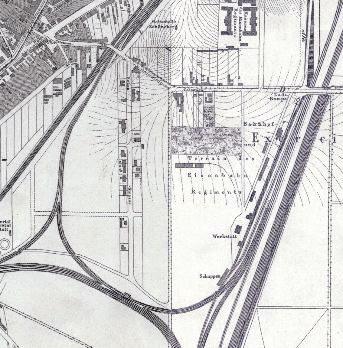 Der Rittergutsbesitzer und Terrainunternehmer Wilhelm Ferdinand Lenz erwarb um 1870 einen langgezogenen Ackerstreifen östlich der Bahntrasse. Hier ließ er inmitten von Feldern eine neue Straße anlegen: die Sedanstraße, heute Leberstraße. Ihre Ausrichtung von Nord nach Süd bestimmte die spätere Straßenplanung der Schöneberger Insel.