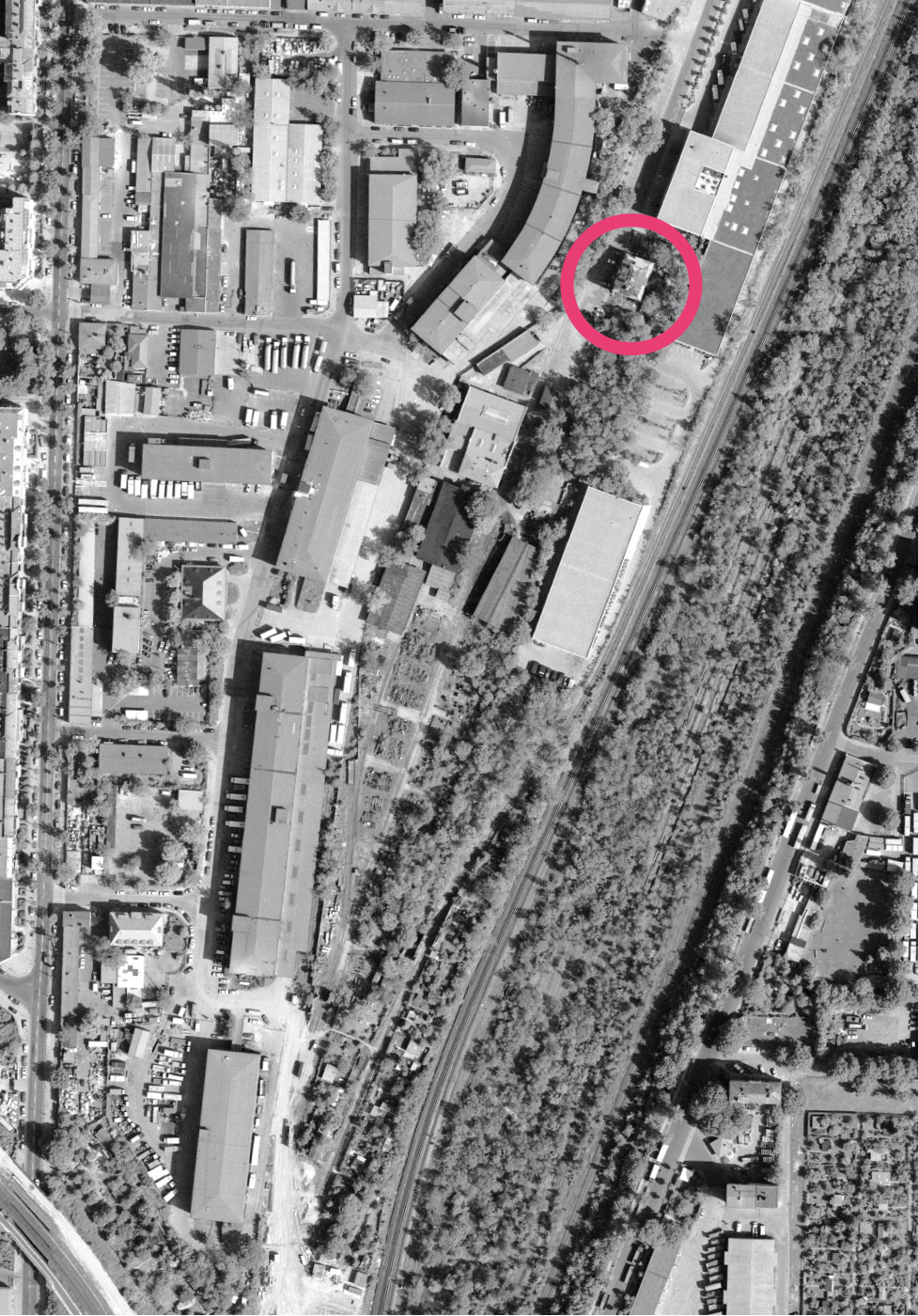 Luftbild von 1992. Markiert ist das ehemalige Magazingebäude, damals Kolonnenstraße 30 E. Dort endete die Straße.
