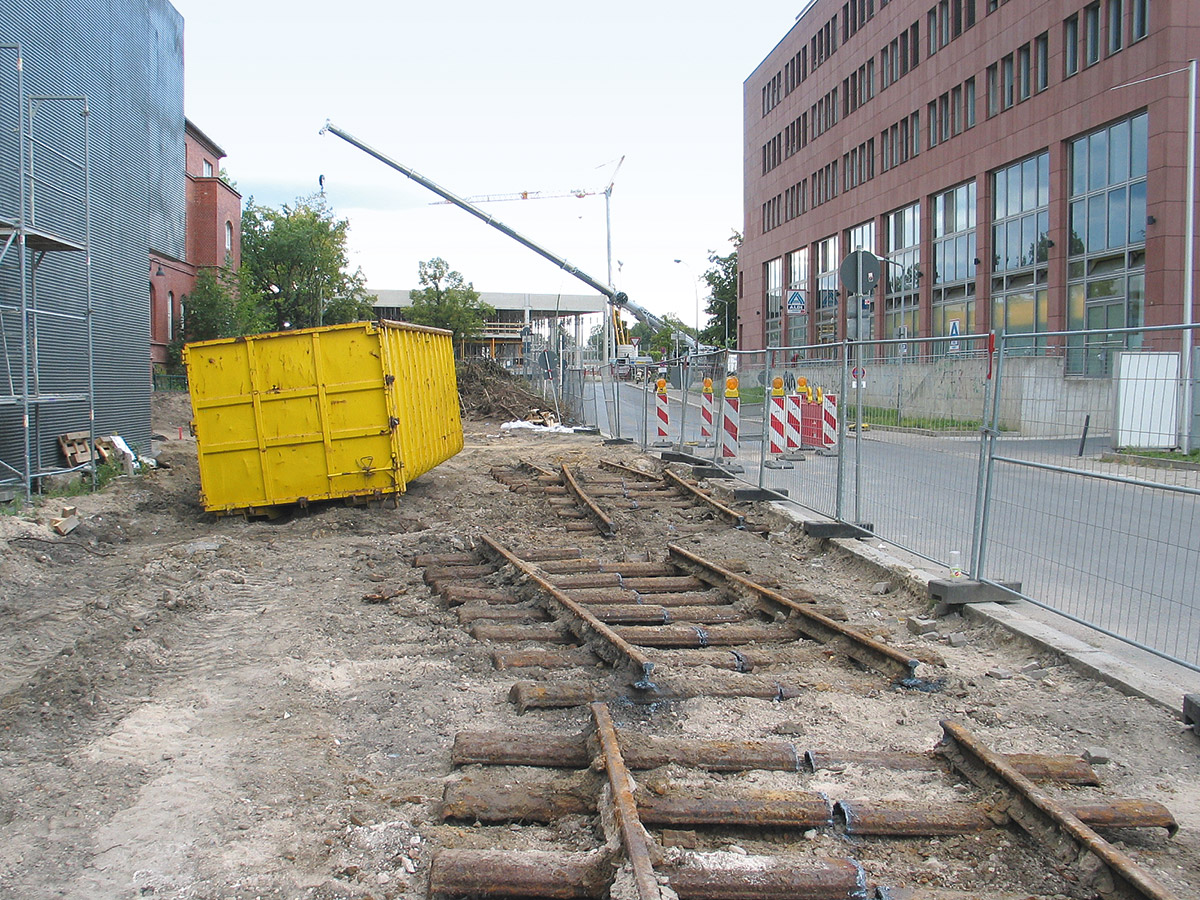 August 2009: Bei den Bauarbeiten zur Wilhelm-Kabus-Straße kommen Reste alter Schienen und Schwellen der Militäreisenbahn zum Vorschein.